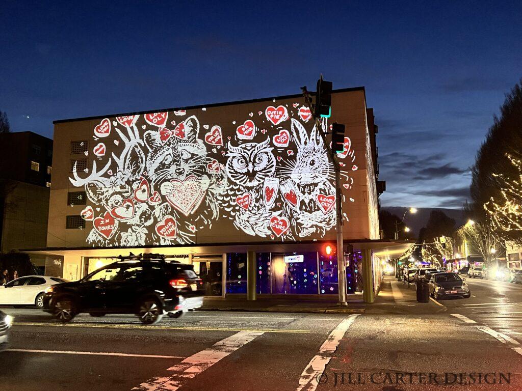I was lucky enough to get hired by the Olympia Downtown Alliance – Love Oly to design an illustration to project on the empty Goldberg